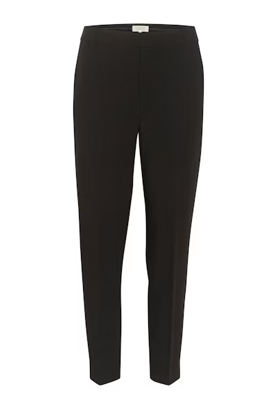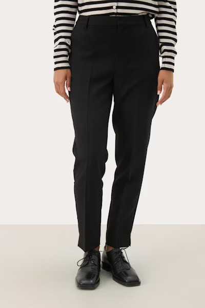 Dressbukser med rett passform og ren linning. Beltehemper og pressede folder gir en elegant og veldefinert silhuett.
