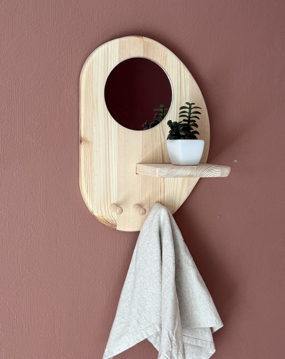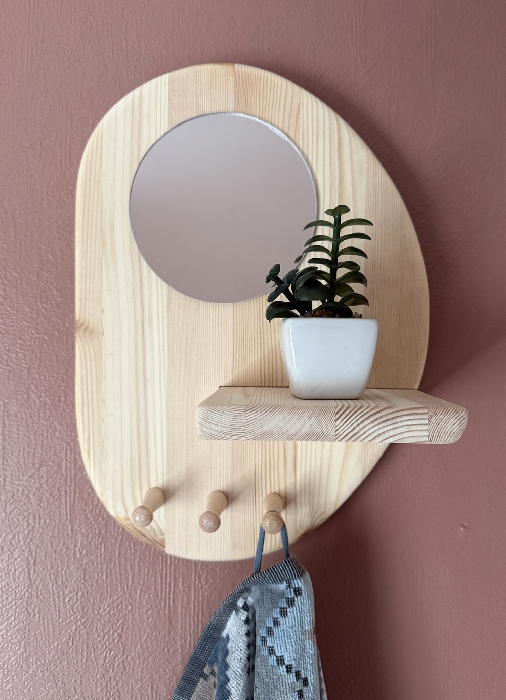 Vegghengt hylle i lyst tre, med speil og 3 knagger.