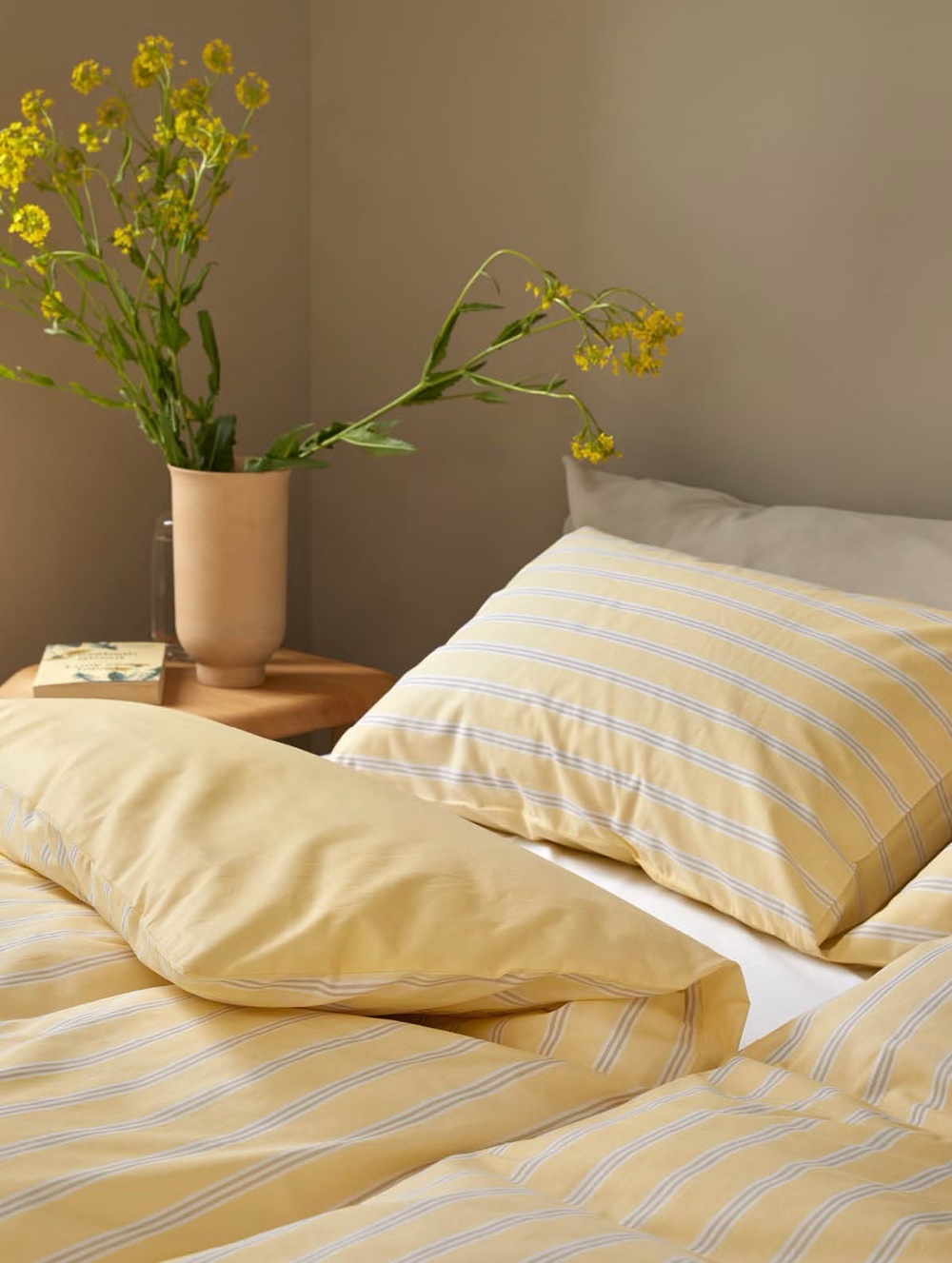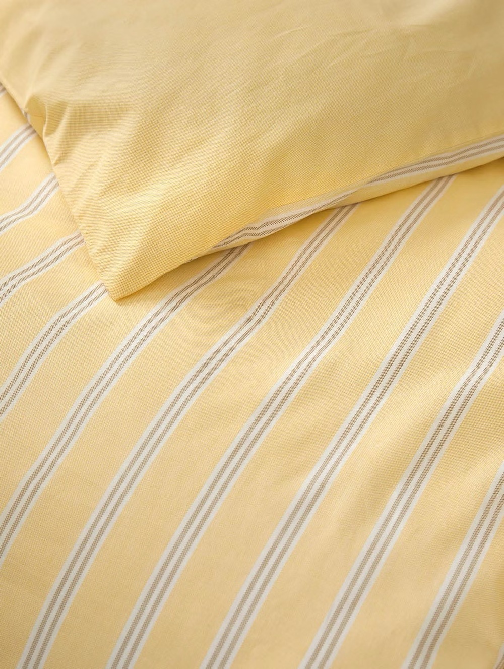 Ylva sengesett i bomull kombinerer myk kvalitet med et lekent og samtidig tidløst uttrykk. Den solgule fargen løfter rommet og tilfører varme, mens de smale stripene skaper et rent og harmonisk preg. Bomullen er kjent for sin mykhet og slitestyrke, noe som gjør Ylva både behagelig å sove i og lett å holde pent over tid. Sengesettet er også behandlet med Easy Care, som gjør at det krøller mindre og ser fresht ut – selv etter mange vask.