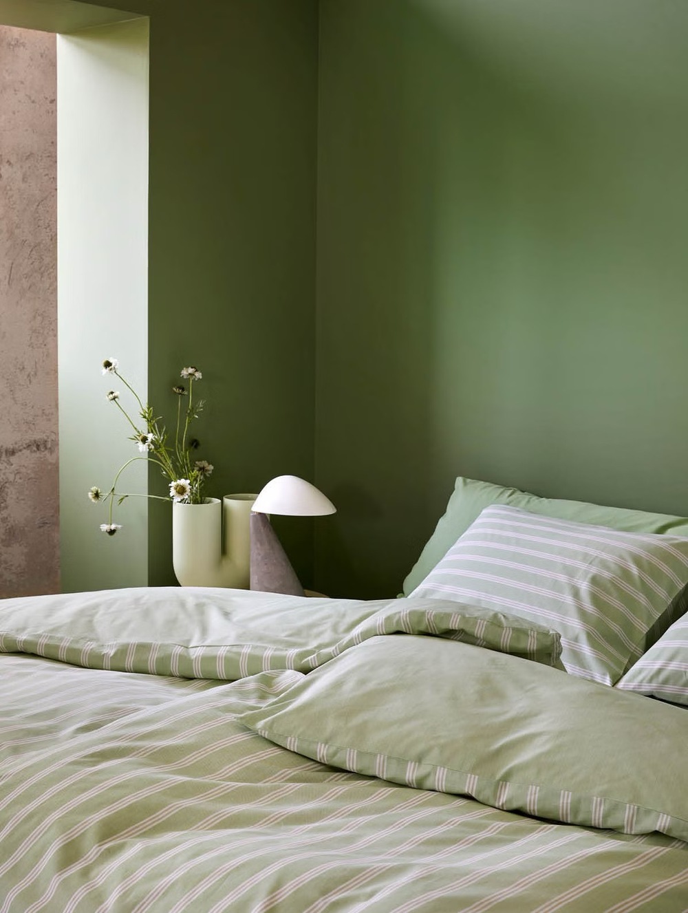 Den milde vårgrønne fargen gir rommet et friskt og balansert uttrykk, mens de smale stripene skaper et rent og klassisk design som passer i alle hjem. Sengesettet er også behandlet med Easy Care, som gjør at det krøller mindre og ser fresht ut – selv etter mange vask.