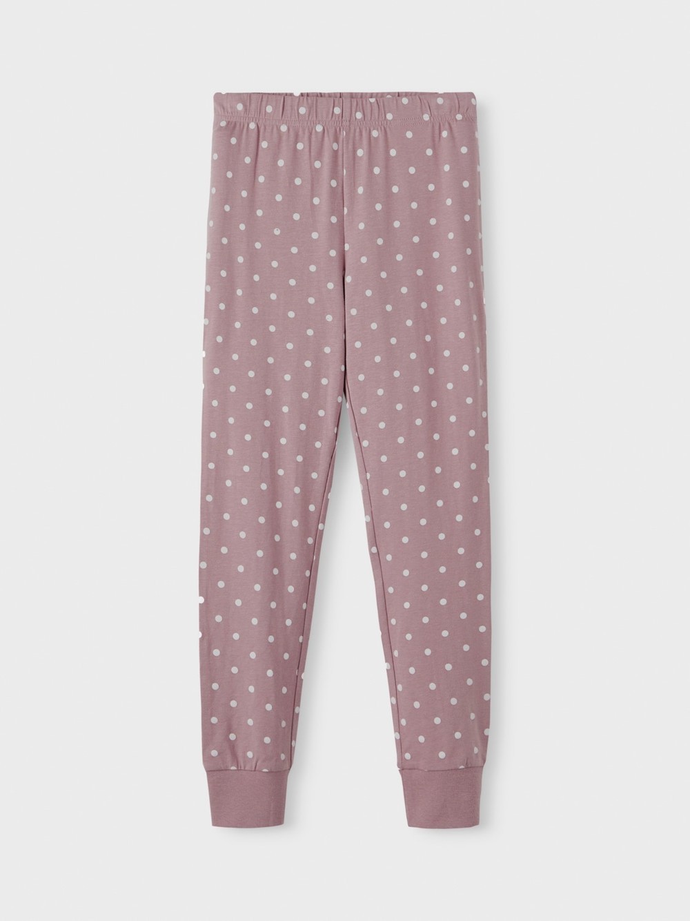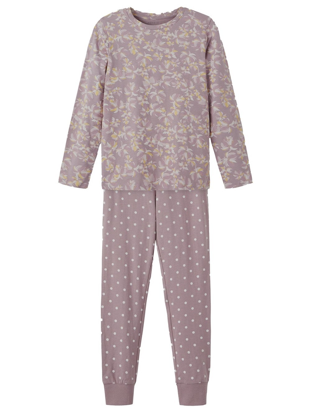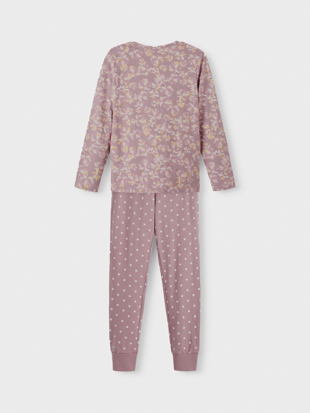 Sett med nattbukse og genser, med blomsterprint på genseren. Ensfarget bukse NB! Bildet viser prikker på buksen. Den er ensfarget i bunnfargen.