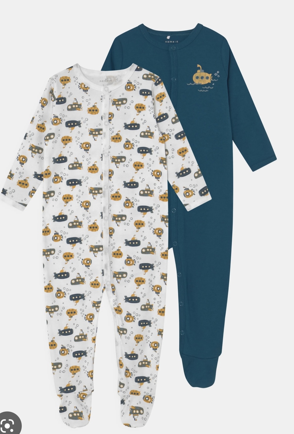 Kvalitet: 51%...Pysj med fot i 2-pk. Pysjene lukkes med knapping. En pysj med print over hele og en ensfarget med et lite print.