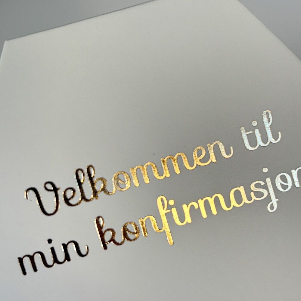 Flotte esker i tykt papir med teksten Velkommen til min konfirmasjon.