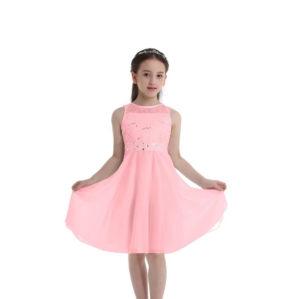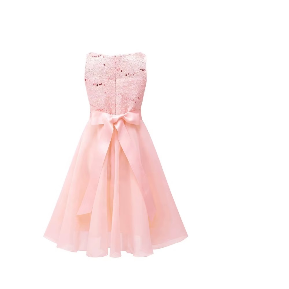 Vakker kjole til jente. Medium lengde. Detaljer med paljetter og blonder på overdel og belte i midje. Lett skjørt med vidde. Passer til anledninger som... Les mer