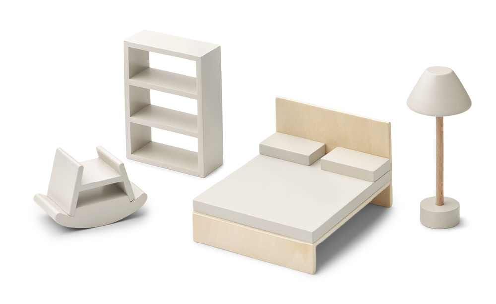 Innred dukkehuset med disse lekre møblene fra Liewood. Settet inneholder: en seng, hylle, lampe og gyngestol.