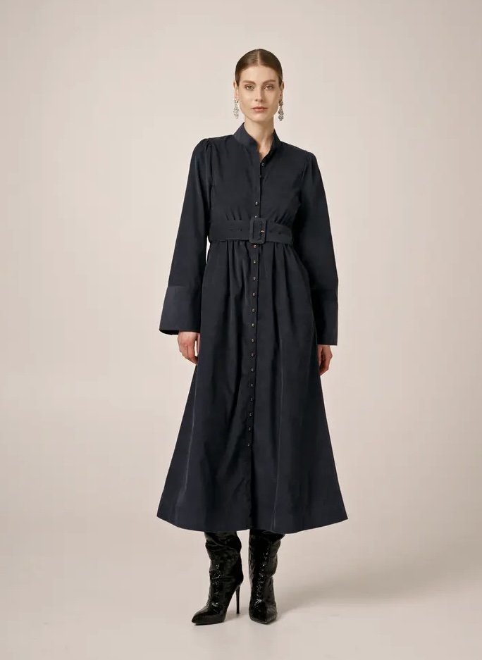 Baby Cord Belt Dress fra by TiMo er laget i deres finribbede GOTS-sertifiserte bomull med en ekstra myk finish. Kjolen har midi-lengde, figursydd topp,...Baby Cord Belt Dress fra by TiMo er laget i deres finribbede GOTS-sertifiserte bomull med en ekstra myk finish. Kjolen har midi-lengde, figursydd topp, A-formet skjørt, mandarinkrage, knapper foran og klokkeermer. Den har beltebøyler og kommer med et løst, matchende belte.