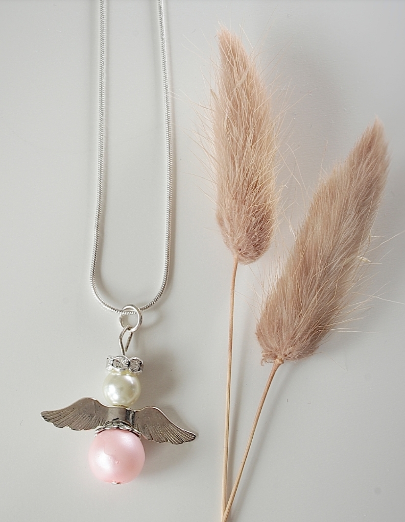 Stor engel i flotte farger. Kjede i sølvemelert farge.