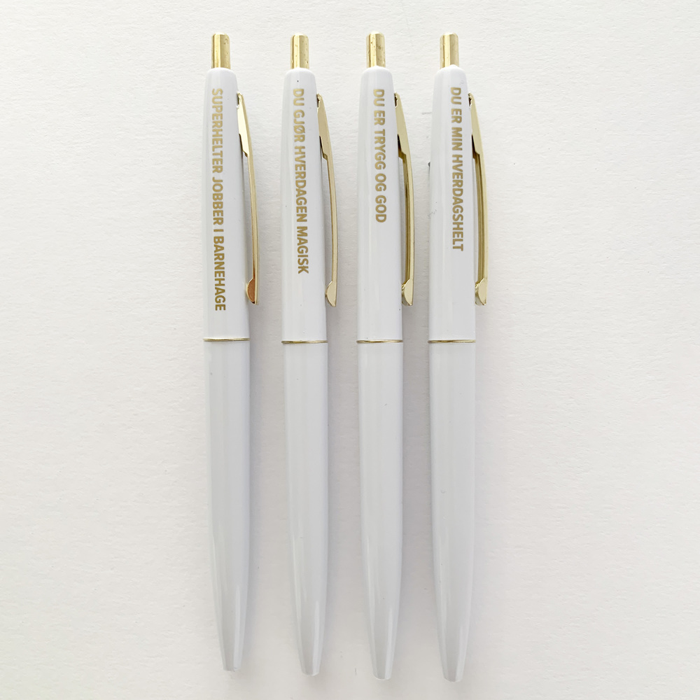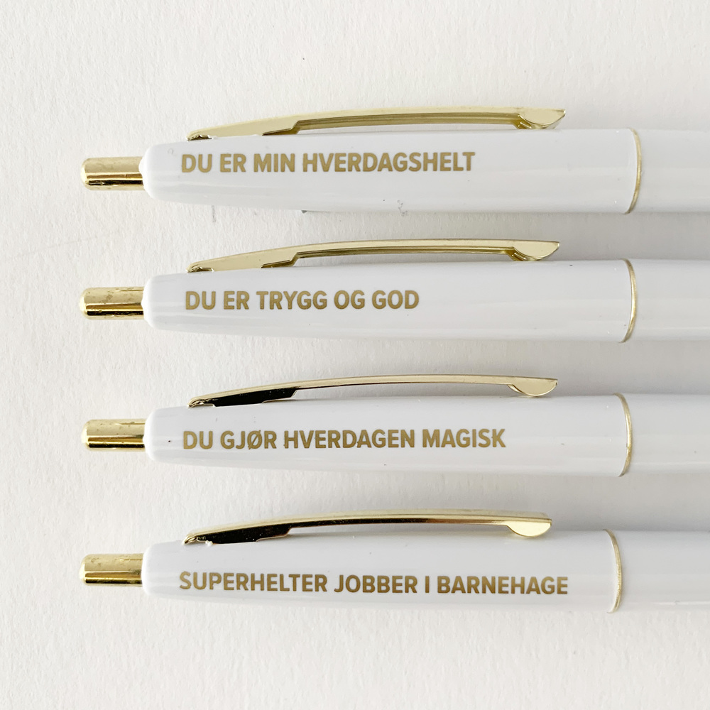 Pakken inneholder 4 kulepenner i hvit med tekst. Tekstene beskriver hva de som jobber i barnehage betyr for både barna og foreldrene.
