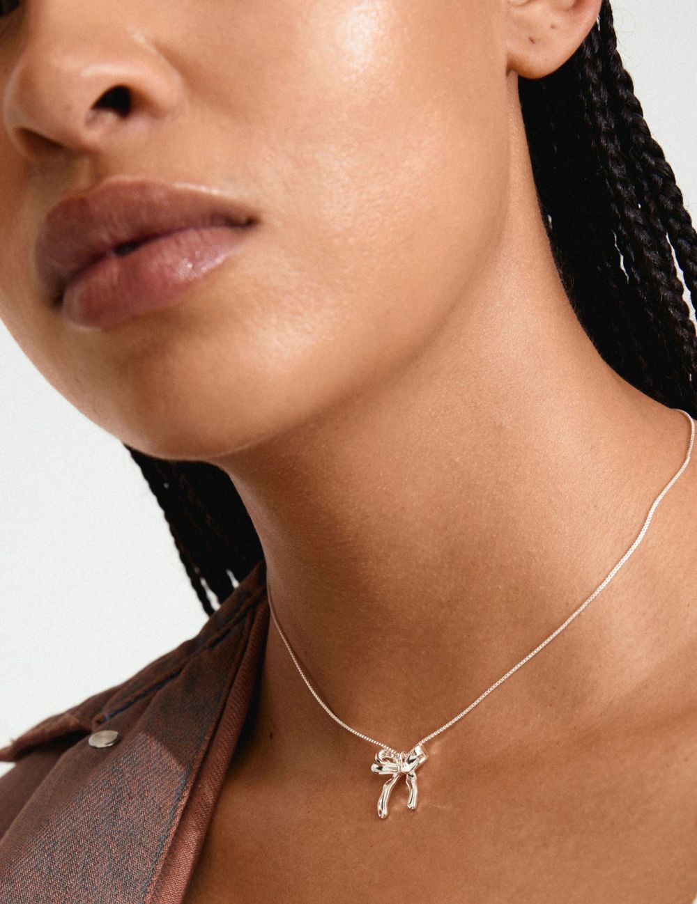 Nydelig sølvbelagt halskjede med trendy sløyfeanheng