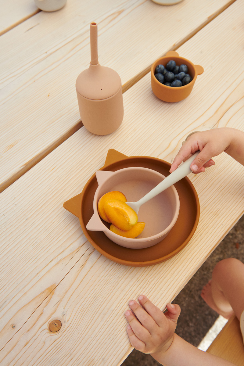 Supert spisesett fra Liewood. Settet inneholder tallerken, skål, kopp med tut og en skje. Kan vaskes i oppvaskmaskin.