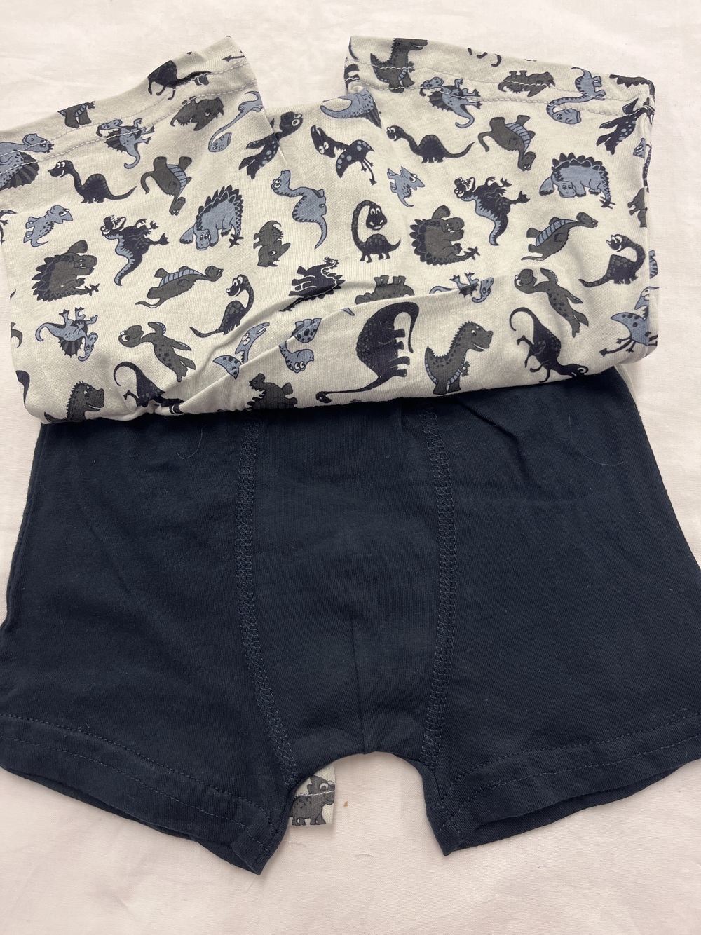 Bokser i 3-pk med leikent dinosaurmotiv. To boksere med motiv og ein ensfarga.