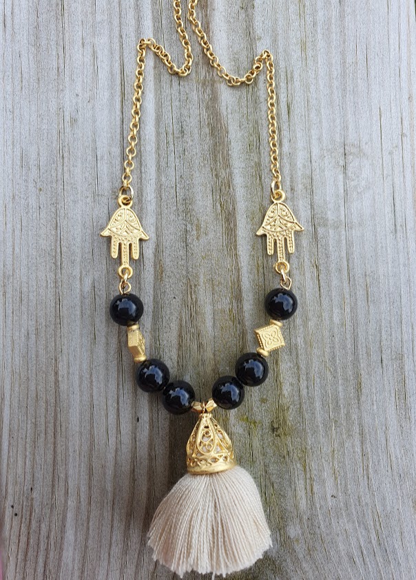 Håndlagde og med mange detaljer. I gullbelagt messing. Mineralsteinen howlitt er brukt på enkelte av kjedene.