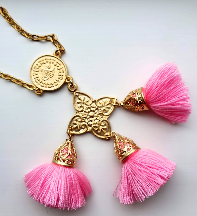 Håndlagde og med mange detaljer. I gullbelagt messing. Mineralsteinen howlitt er brukt på enkelte av kjedene.