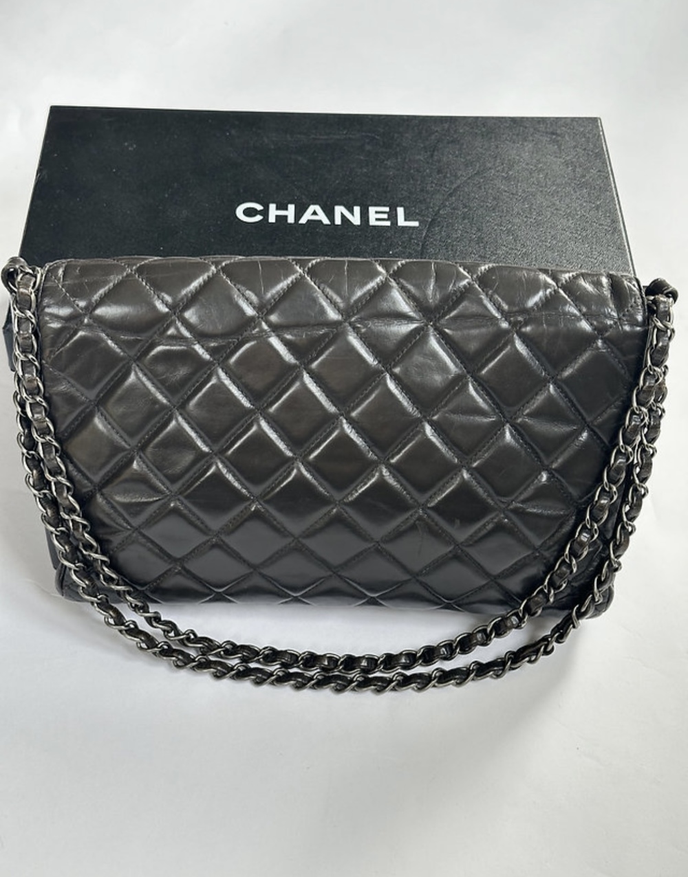 Den har...Lekker Chanel Boy Flap i Medium str fra 2012 i den spesielle fargen charcoal brown. Den er i tykt, slitesterkt skinn med sølvfarget hardware.
