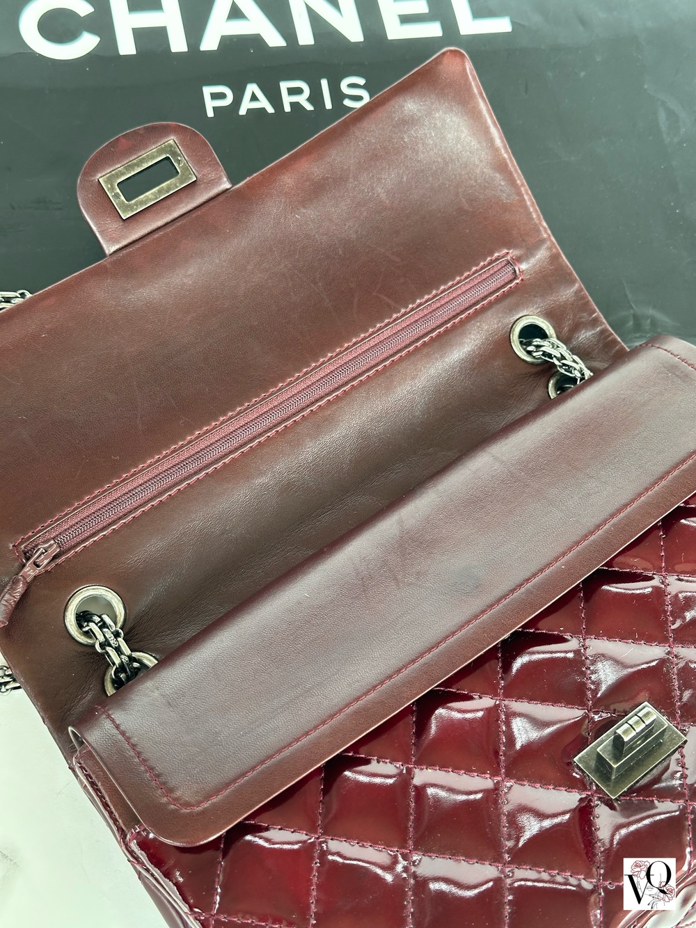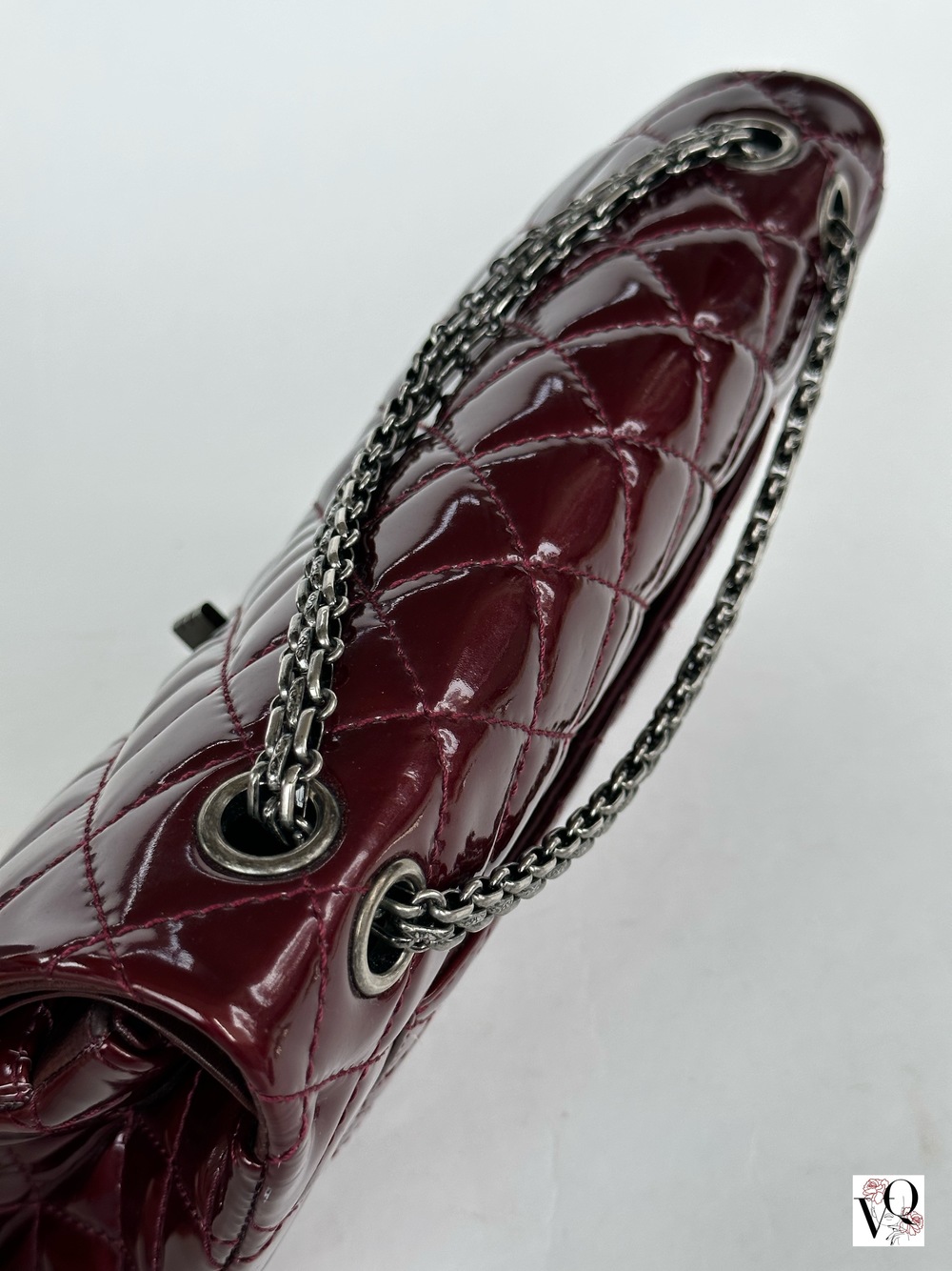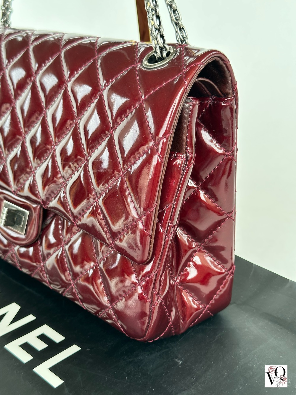 Lekker Chanel Reissue 2.55 Double Flap i Medium fra 2010-2011 i bordeaux patent skinn med svart/sølvfarge på hardware.