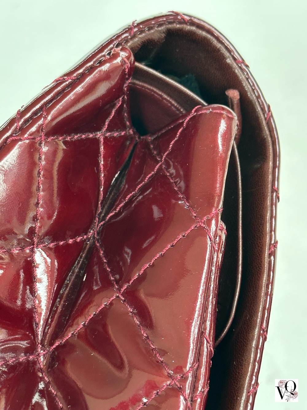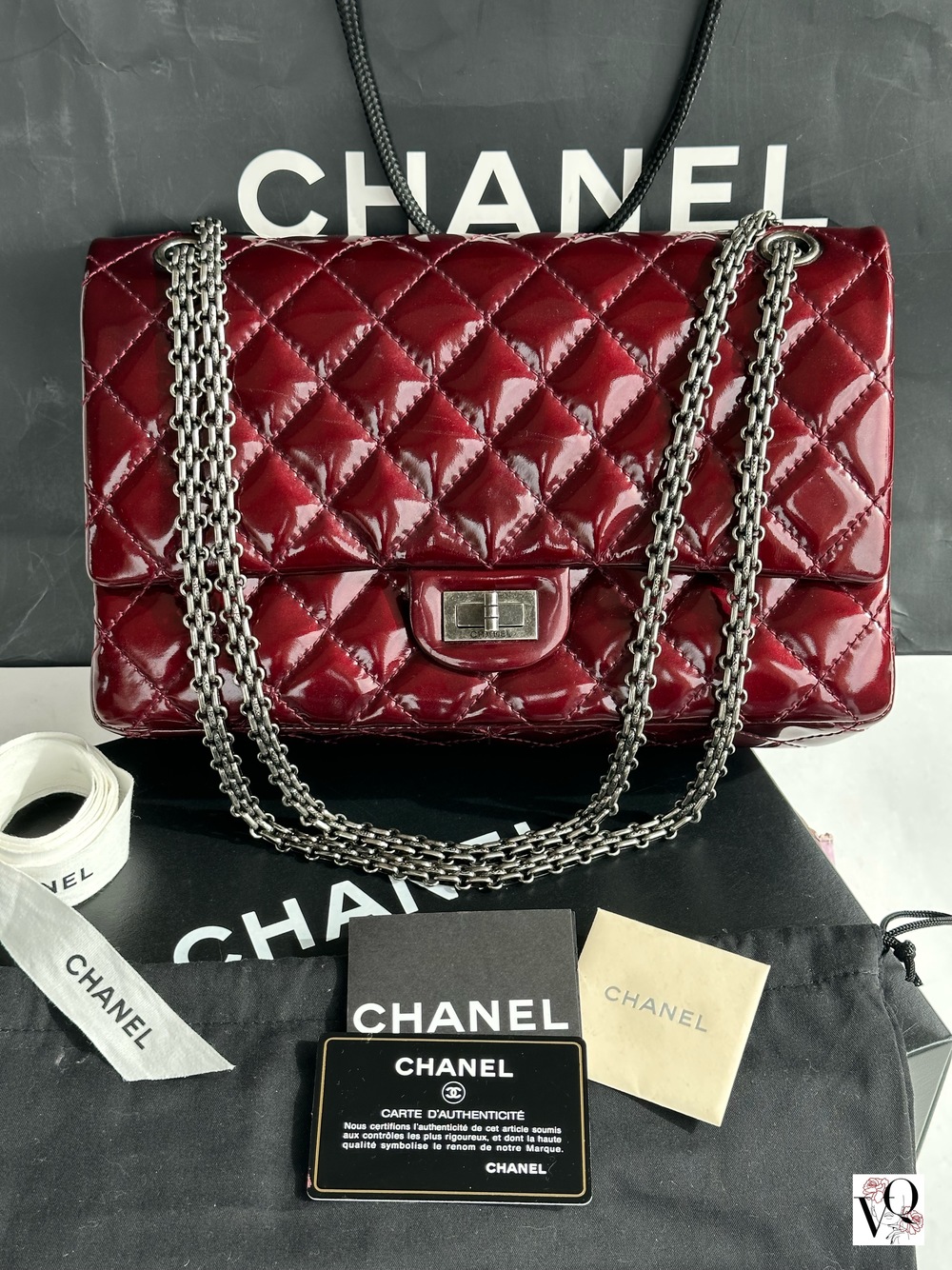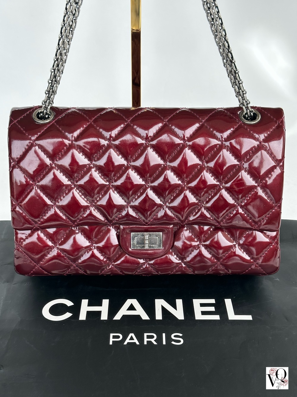 Lekker Chanel Reissue 2.55 Double Flap i Medium fra 2010-2011 i bordeaux patent skinn med svart/sølvfarge på hardware.