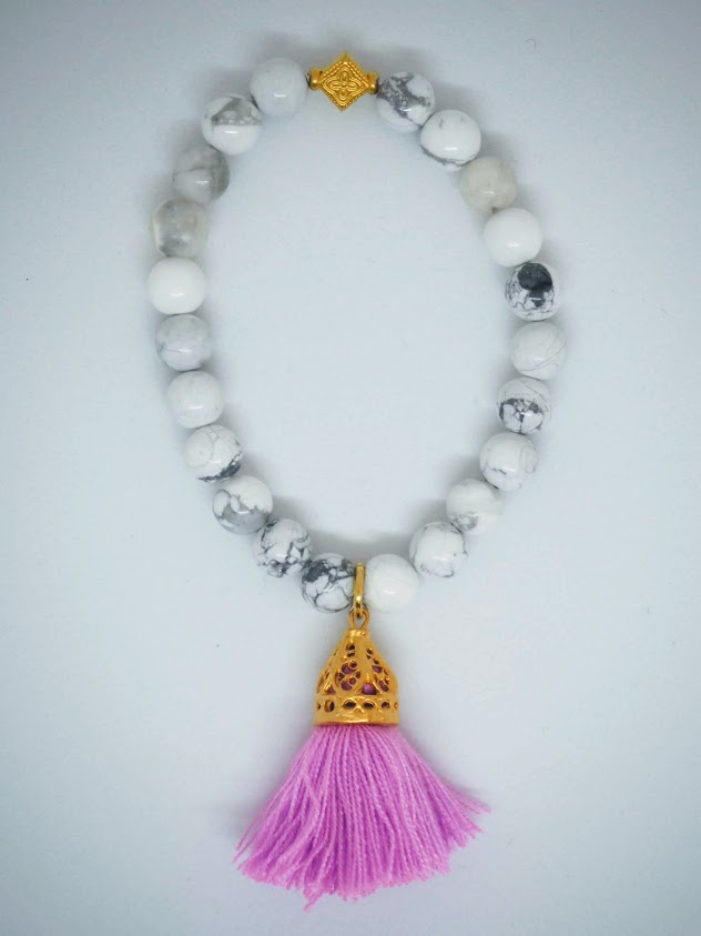 Håndlagd armbånd fra australske Isle & Tribe. Armbåndet er laget av howlitt-steiner. Det sies at disse skal virke beroligende og stressdempende. Gullbelagt messing. Med dusk.