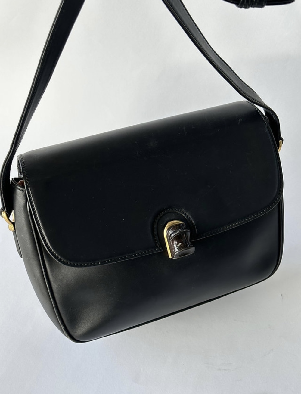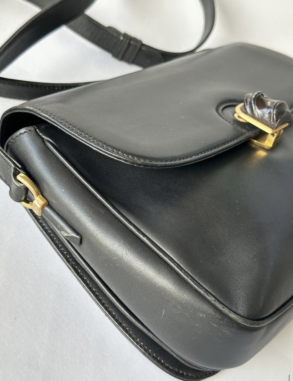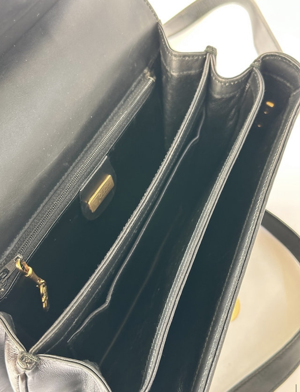 Lekker Vintage Gucci veske i svart skinn med gullfarget hardware. Den har 4 åpne rom inni og et mindre rom med glidelås.