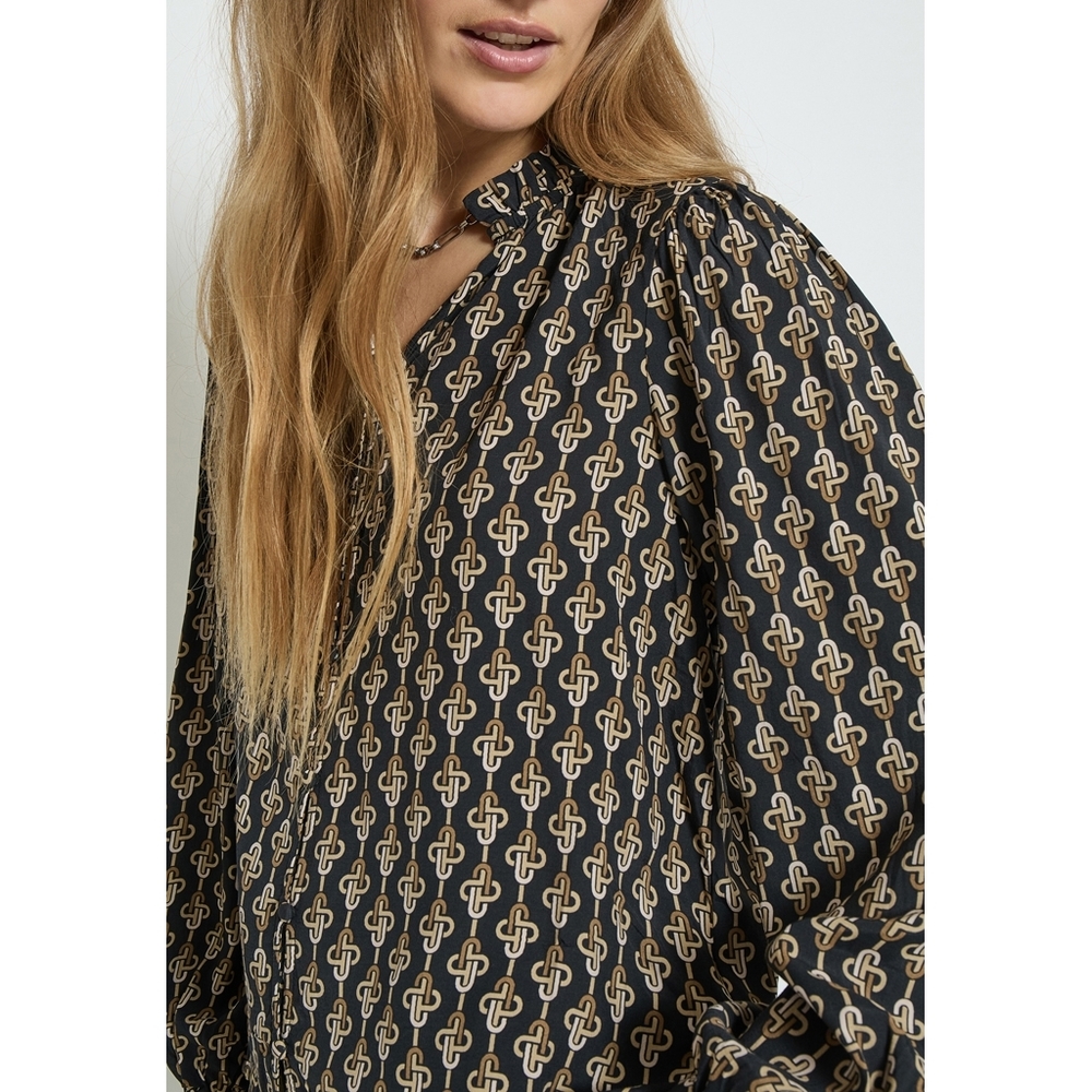 Bluse i 100 % viskose frå Minus. Sort med beige-brunt mønster. Vaskes på 30%.
