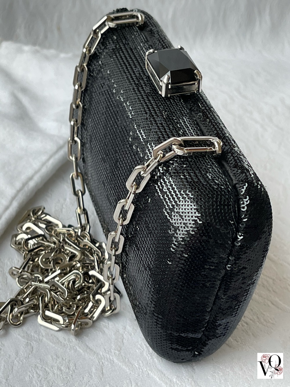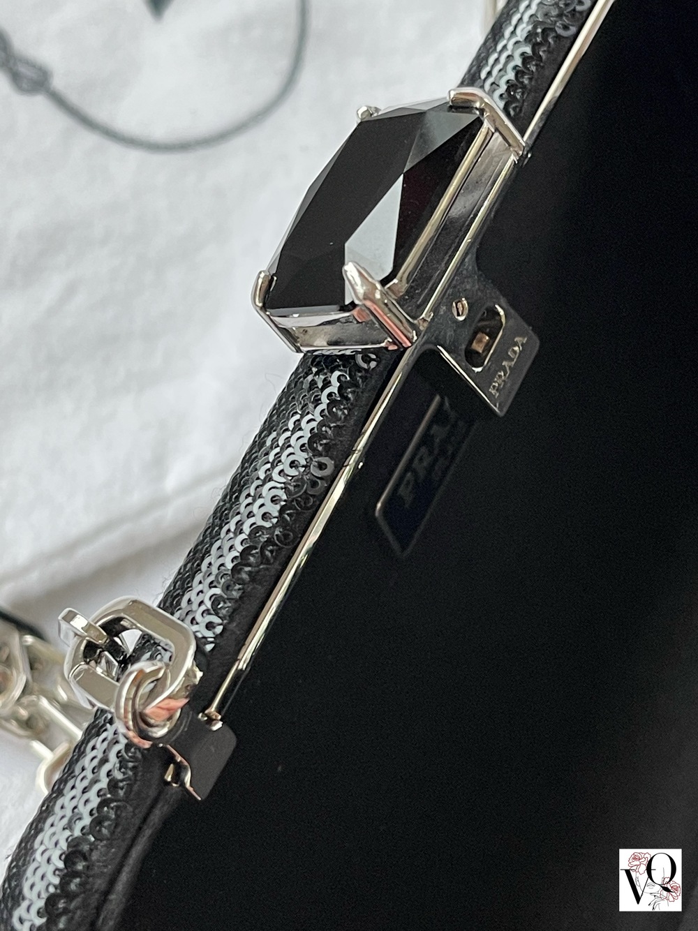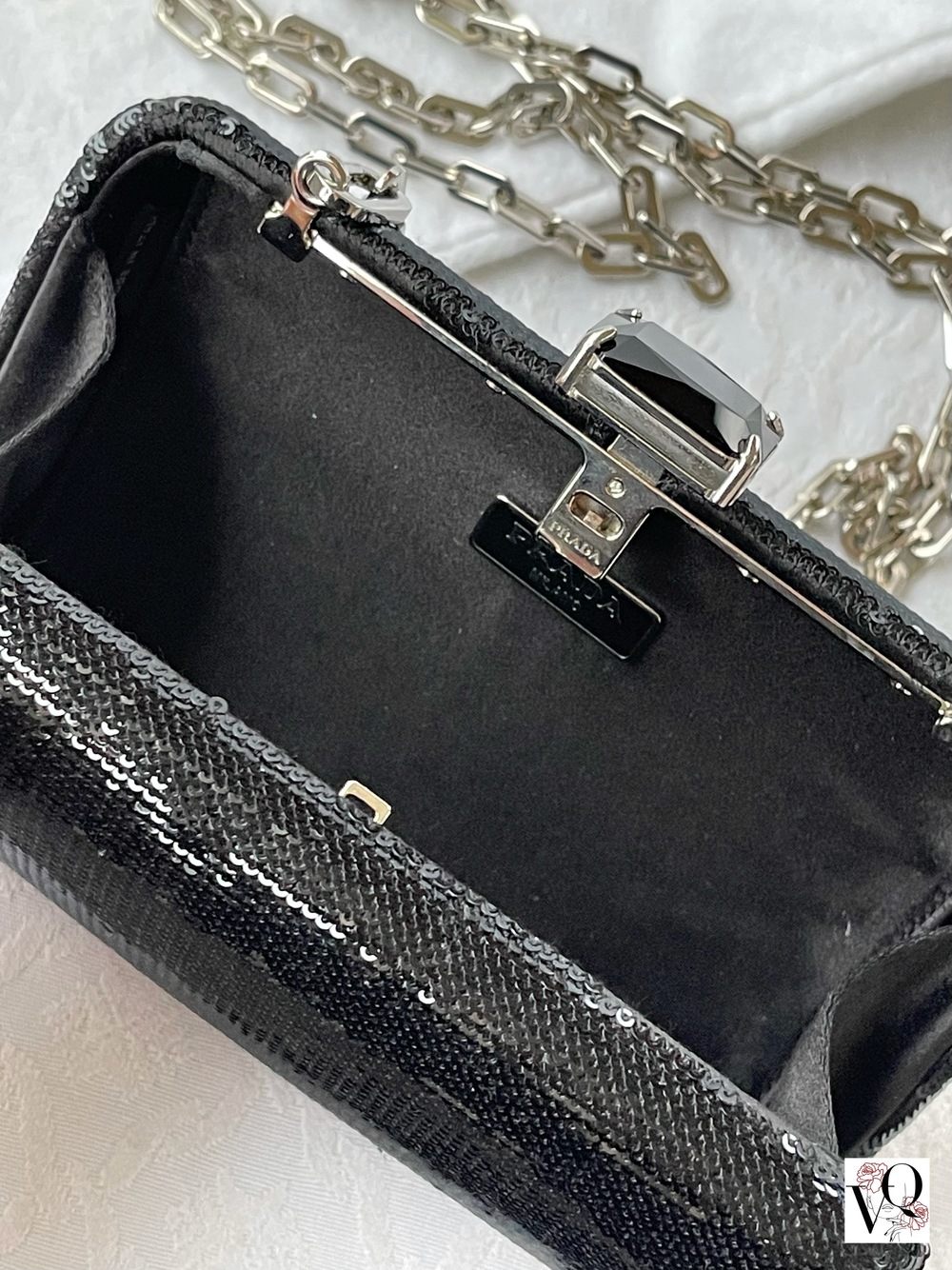 Spesiell Prada Sequin dream i nydelige svarte paljetter med sølv hardware. Den åpnes/lukkes med en svart «diamant» stein. Den har et stort og et lite,...Spesiell Prada Sequin dream i nydelige svarte paljetter med sølv hardware. Den åpnes/lukkes med en svart «diamant» stein. Den har et stort og et lite, åpent rom i inni. Den kan brukes som crossbody og clutch. Lenken kan festes av/på etter behov! Nyprisen var 11800 kr! Mål: 17 cm lang, 10 cm høy og 4 cm bred. Lenken er ca 125 cm lang. Stemplet: Made in Italy! Den kommer med original dustbag, autentisitetskort og taggs.