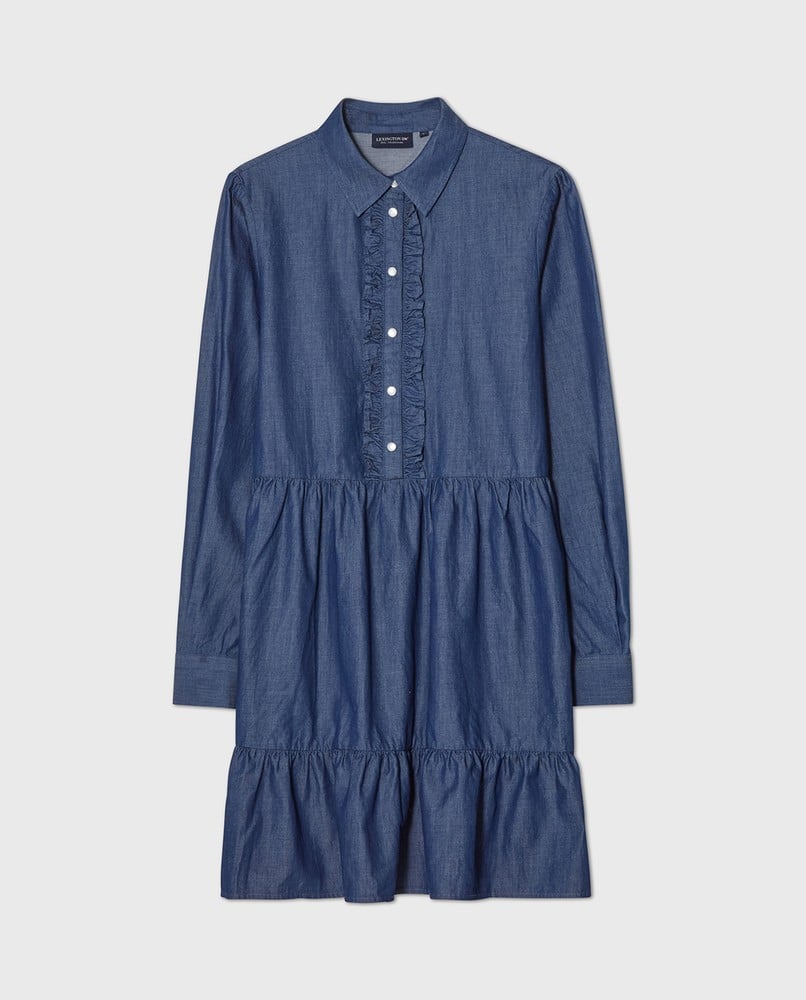 Lexingtons Denim Frill Tunic-kjole kombinerer klassisk denimsjarm med feminine detaljer for et allsidig tilskudd til garderoben din. Den flatterende A-linjesilhuetten skaper et avslappet men elegant...Lexingtons Denim Frill Tunic-kjole kombinerer klassisk denimsjarm med feminine detaljer for et allsidig tilskudd til garderoben din. Den flatterende A-linjesilhuetten skaper et avslappet men elegant utseende, mens de volumiøse ermene tilfører et dramatisk preg til dette casual plagget. Delikate rysjedetaljer på nedre kant og rundt knapperaden løfter denne tunikakjolen med et subtilt romantisk preg. Laget av 100 % bomull i en vakker denimblå nyanse, gir den både komfort og holdbarhet for hverdagsbruk. Stil den med leggings og støvler på kjøligere dager eller bruk den som et frittstående plagg med sandaler når temperaturen stiger – denne allsidige tunikaen overgår sømløst mellom sesongene.