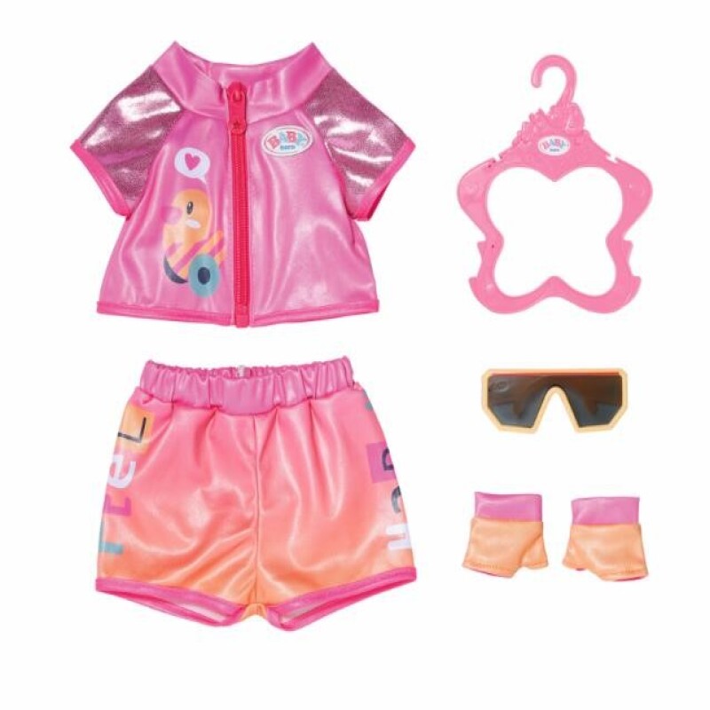Å kjøre på to eller trehjulsykkel er dobbelt så gøy når du har et sporty sykkeloutfit som dette! Settet med shorts og bluse i fargene...Å kjøre på to eller trehjulsykkel er dobbelt så gøy når du har et sporty sykkeloutfit som dette! Settet med shorts og bluse i fargene rosa og oransje vekker virkelig oppsikt og blir komplett med matchende hansker og solbriller. BABY born og BABY born bamse har aldri sett så bra ut på en sykkeltur.