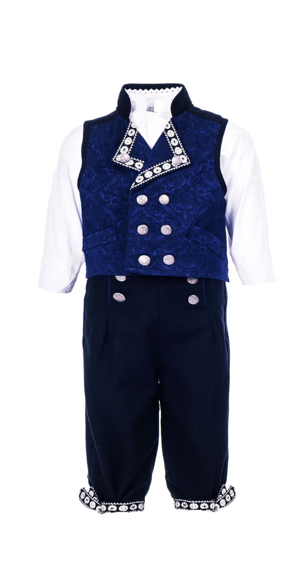 Gutt leveres med caps eller strømpebukse. Salto drakt til gutt: Bomullsskjorte og nikkers med skinn "bak", seler og brokadevest med bånd og knapper. Polyester og bomull.
