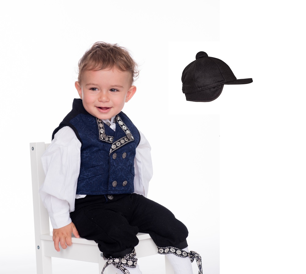 Gutt leveres med caps eller strømpebukse. Salto drakt til gutt: Bomullsskjorte og nikkers med skinn "bak", seler og brokadevest med bånd og knapper. Polyester og bomull.