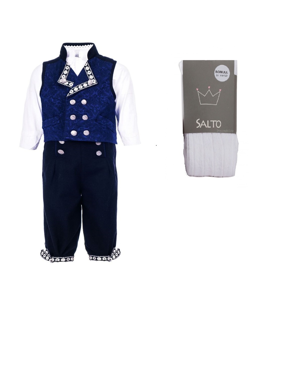 Gutt leveres med caps eller strømpebukse. Salto drakt til gutt: Bomullsskjorte og nikkers med skinn "bak", seler og brokadevest med bånd og knapper. Polyester og bomull.