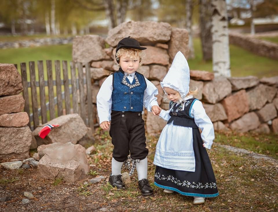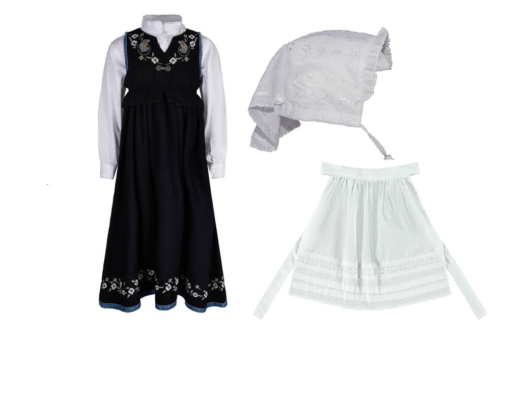 Festdrakt fra Name It i nydelig marine ullstoff og blomster broderi. Pene detaljer og bånd. En variant med blå blomster, forkle og sølje. Annen med... Les mer