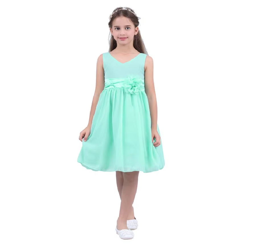 Vakker kjole til jente. Medium lengde. Blomst og belte i midje. Lett skjørt med vidde. Passer til anledninger som ball, bryllup, konfirmasjon, dåp eller når... Les mer