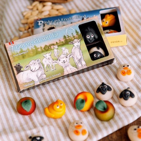 På den sagnomsuste Fryda gård i hjertet av Telemark, bor det 7 glade...Ingen påske uten påskelam - ei heller det sorte fåret. Deilige små marsipanfigurer.