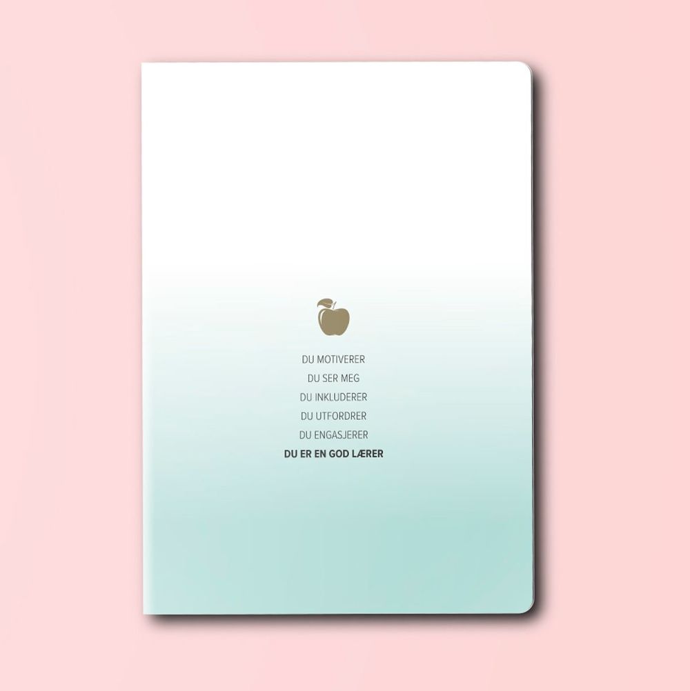 En kjempeflott notatbok til læreren. Teksten på forsiden beskriver en god lærer. Ikon i gullfolie