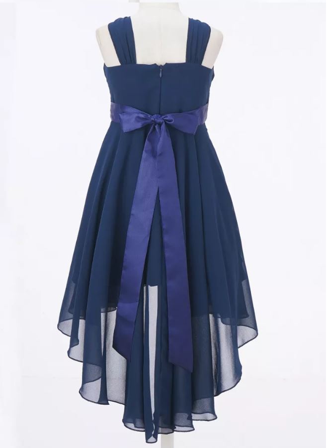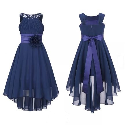 Vakker kjole til jente. Medium lengde. Pen hals med stener på overdel. Bred midje med knyting bak og lett skjørt. Blomsten har sikkerhetsnål og kan... Les mer
