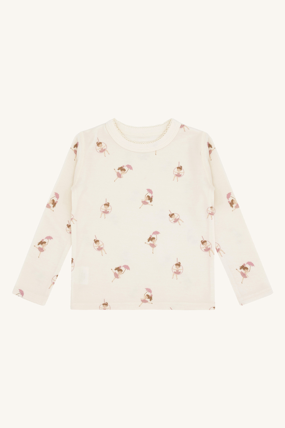 Trøye med print av ballerina. Bambus innside og ull ytterside.