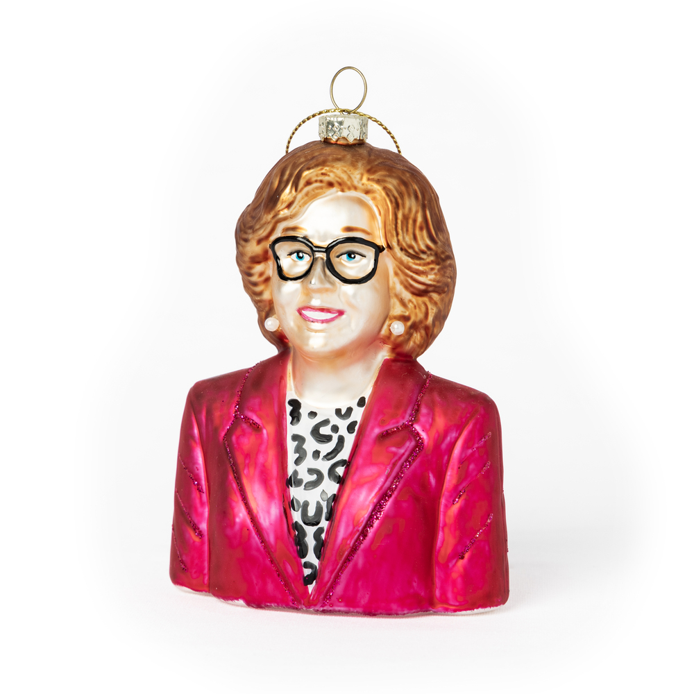 Truden ikledd sin knæsj rosa blazer, sebra-skjorte og ikoniske briller. Julekulen er 11 cm høy og kommer i en fin eske.
