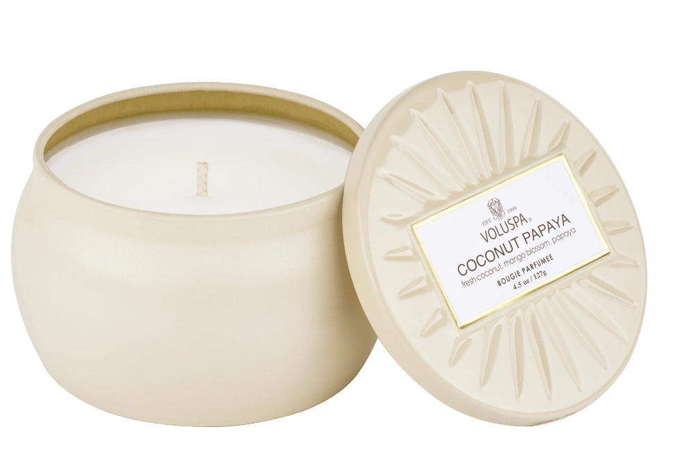Voluspa's unique coconut wax blend is hand-poured into a 4 oz. metal vessel adorned in verneil pattern and is topped with a matching lid that keeps the candle dust-free when not in use. The single wick allows you to enjoy fragrance throw for 25 hours. Our candles are hand-poured in the United States and feature our proprietary, clean-burning coconut wax blend and 100% natural wicks. Our products are free of phthalates, pesticides, parabens and sulfates and are never tested on animals. Up-cycle this best seller into a keepsake after the last burn.