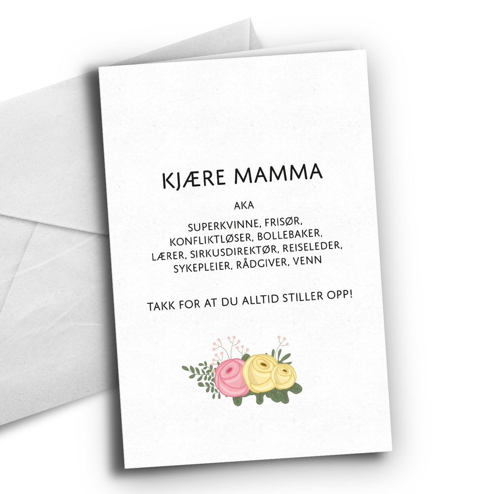 Kortet er dobbelt med hvit innside. Format: 10 X 15 cm. Hvit konvolutt inkludert.