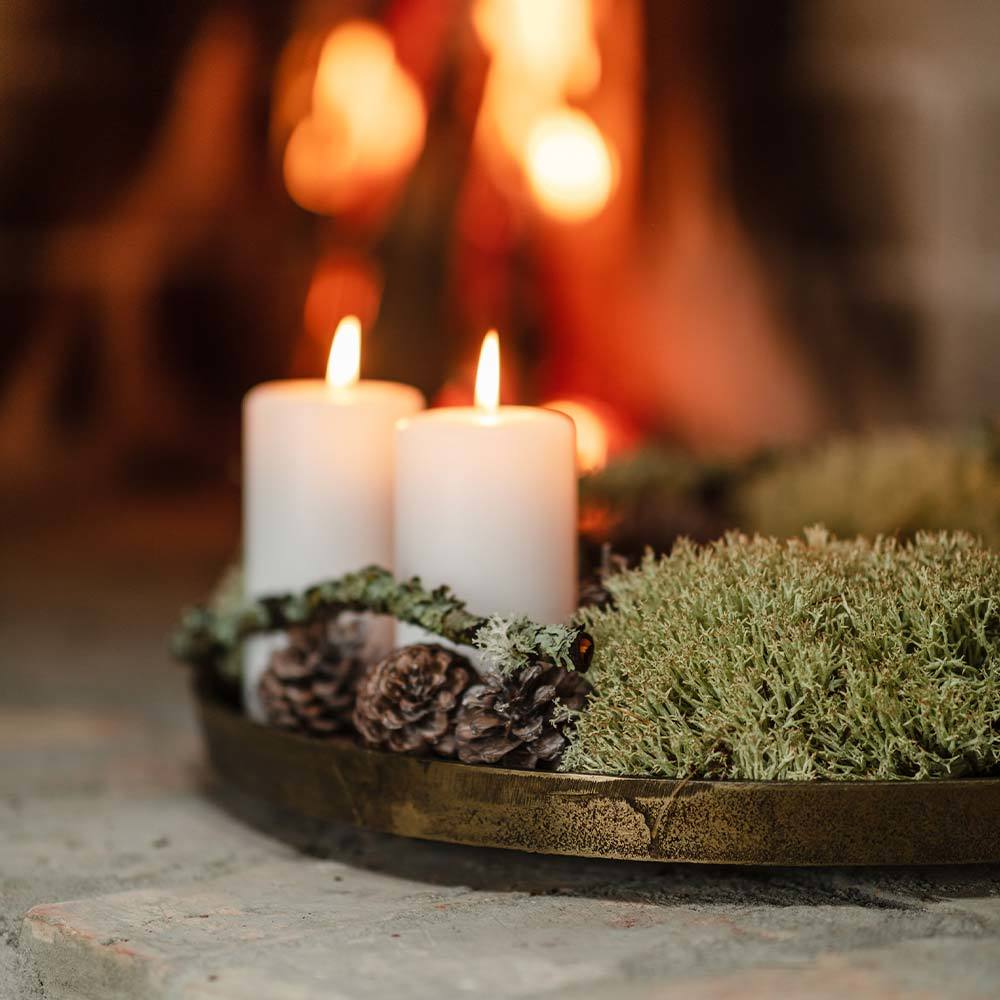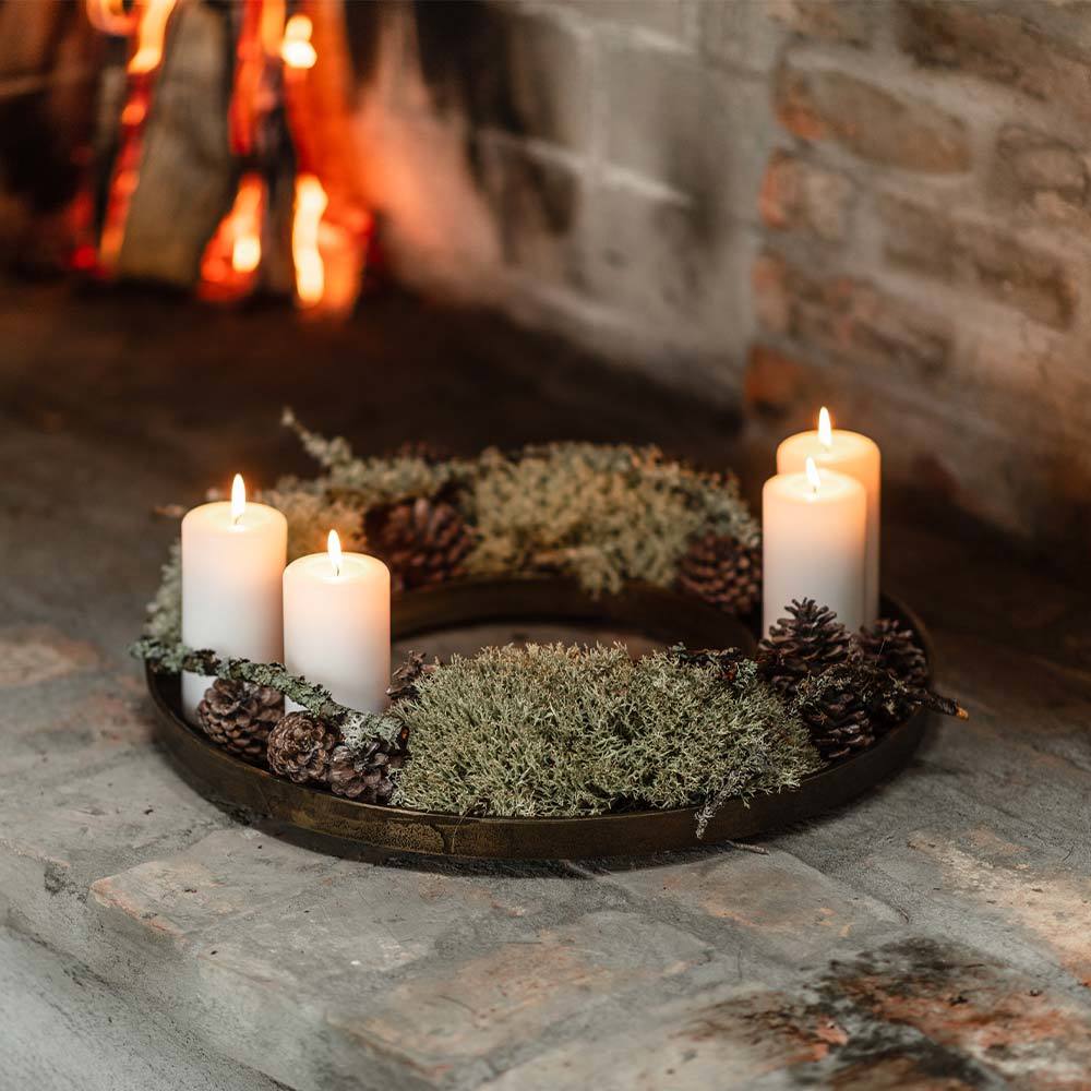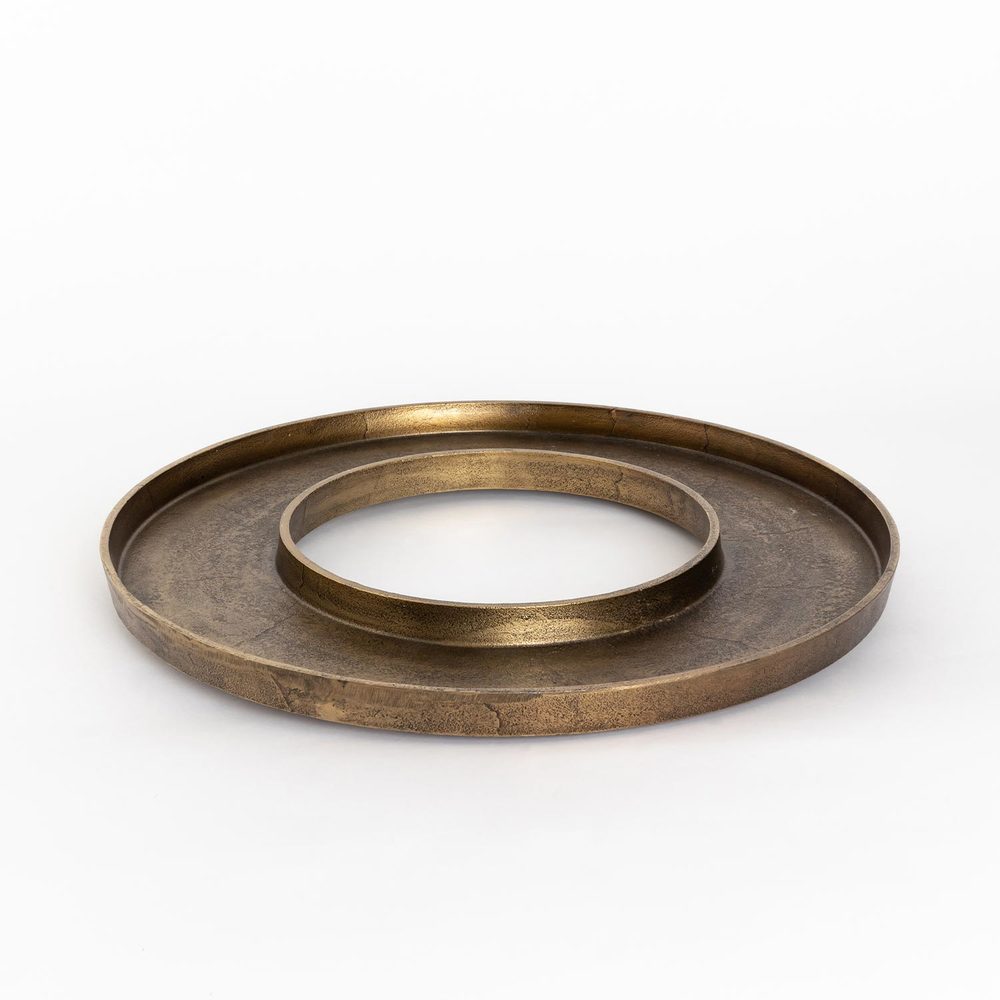Stort, rundt lysfat i patinert aluminium med hull i midten. Flott som adventsstake eller for å samle små dekorelementer. Mål 55 x 4 cm