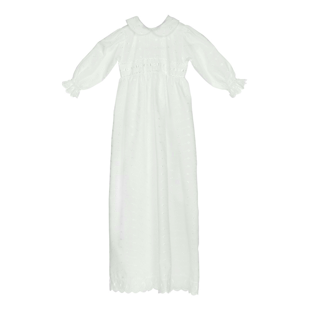 Nydelige dåpskjole med blonde mønster, krage og lange armer med strikk nederst. Til både gutt og jente. Størrelser 62-68 cm.