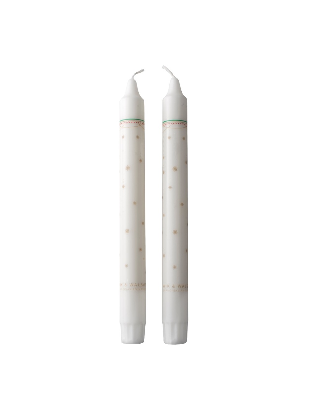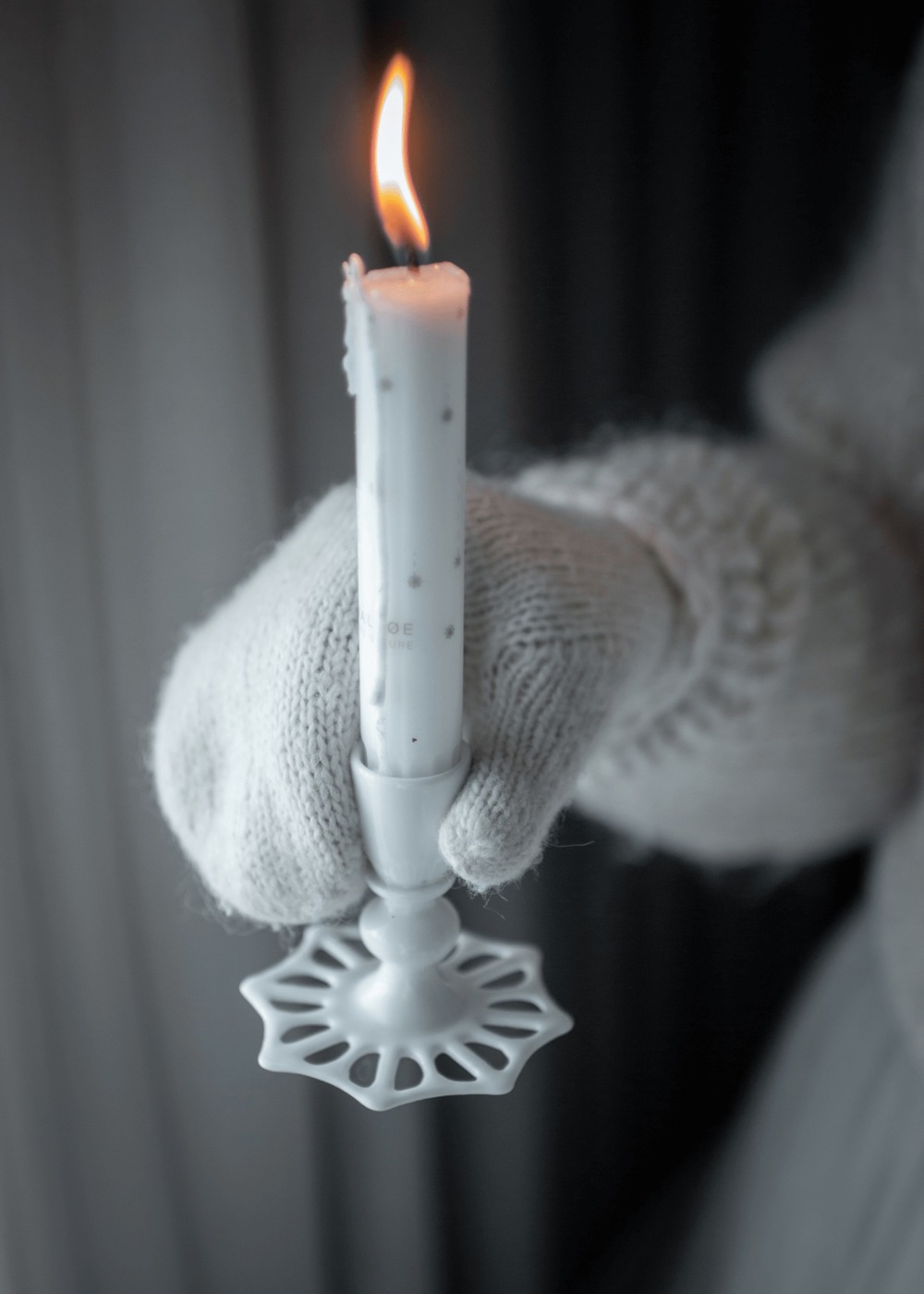 Julemorgen kronelys er dekorert med delikate hjerter, snøfnugg og girlandere.