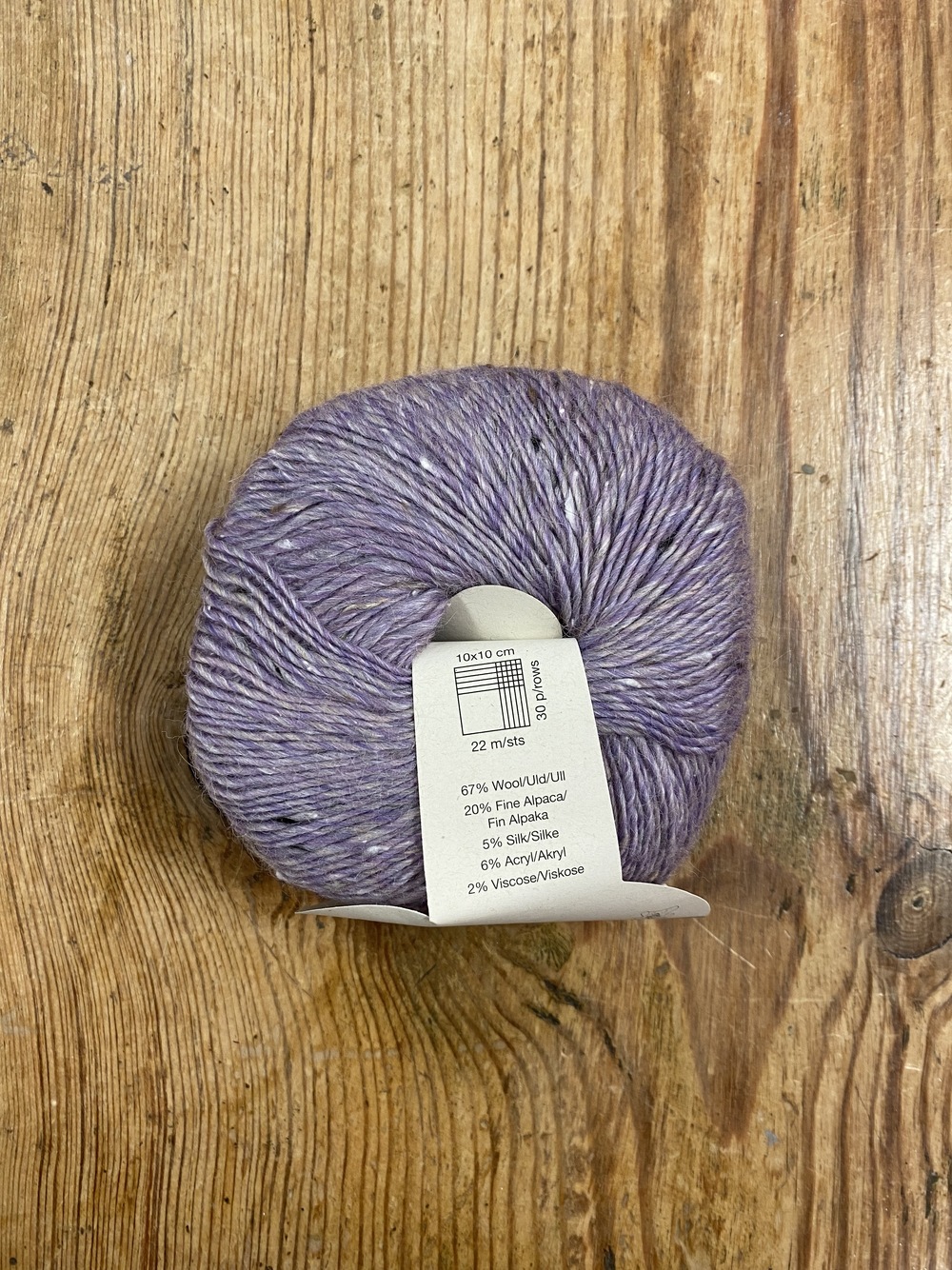 Garn med 67% ull, 20% fin alpakka, 5% silke, 6% akryl og 2% viskose.