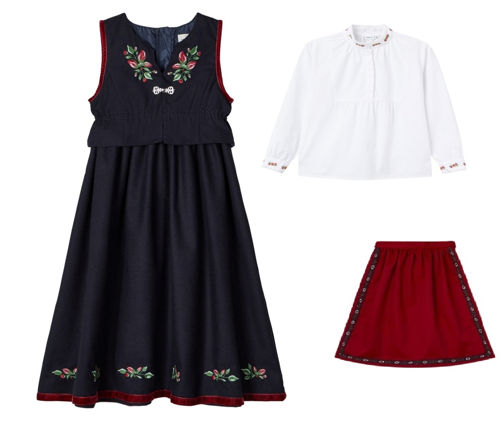 Festdrakt fra Name It i nydelig marine ullstoff og blomster broderi. Pene detaljer og bånd, med røde blomster. Drakten er litt stor i størrelsen. Levers...Festdrakt fra Name It i nydelig marine ullstoff og blomster broderi. Pene detaljer og bånd, med røde blomster. Drakten er litt stor i størrelsen. Levers med skjorte og rødt forkle. Store størrelser (over 8 år) har hvit forkle. Skjorten har blomsterbroderi i rødt.