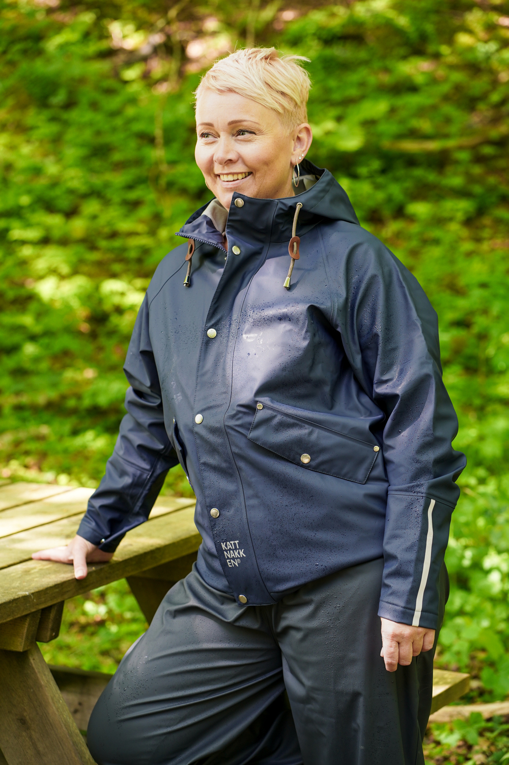 Fortsatt med vannstopper, knappar på ermer, enkel-glidelås, knappar og mobillomme. Hetta er fôra med regntøystoff....Kattnakken si klassiske unisex-regnjakke er her lansert som ein kortare modell.