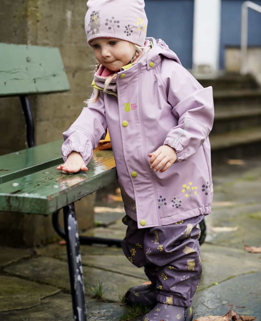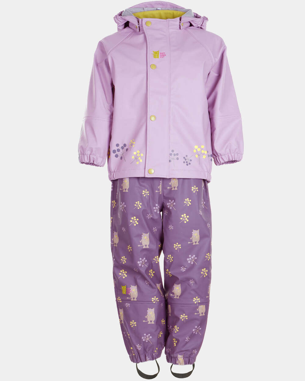 Kattnakken Plask! Her er både jakke og bukse i same gode PU kvalitet, med børsta innside. Det er mjuk fleece på insida av kragen og...Kattnakken Plask! Her er både jakke og bukse i same gode PU kvalitet, med børsta innside. Det er mjuk fleece på insida av kragen og vannstopper finst i både ermer og bein. Her er det slitesterk gummistrikk under føtene, refleksar på jakke og bukse, og mykje moro i print og andre detaljar. Sveisa saumar og sikker hette som er både avtagbar og regulerbar.