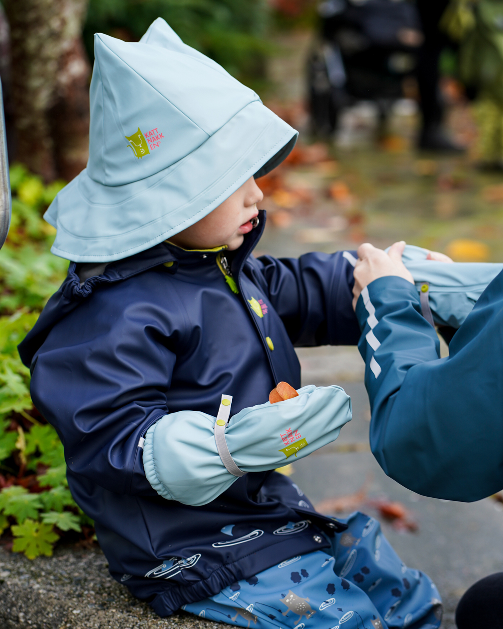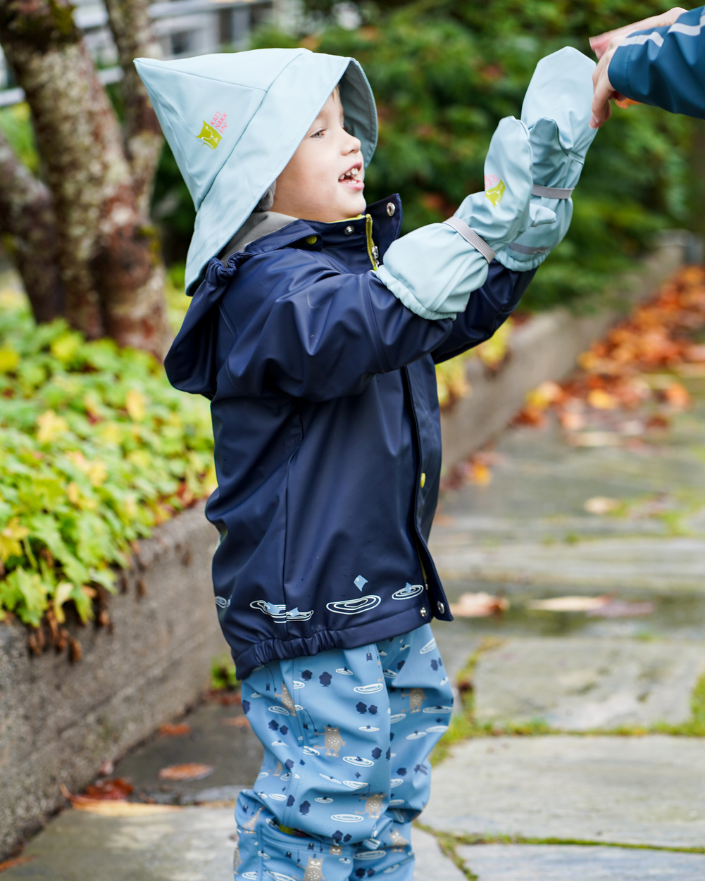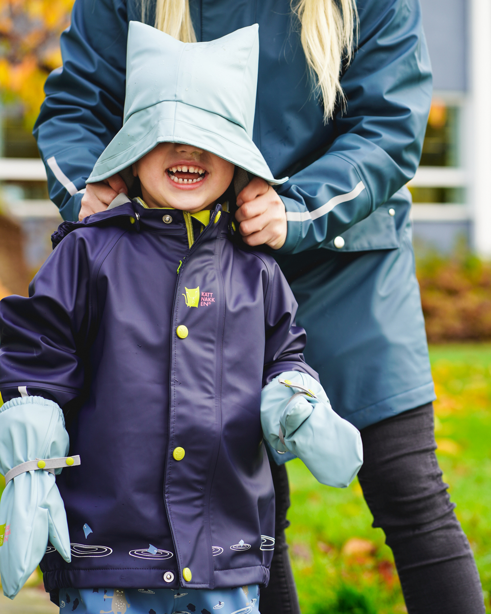 Kattnakken Plask! Her er både jakke og bukse i same gode PU kvalitet, med børsta innside. Det er mjuk fleece på insida av kragen og...Kattnakken Plask! Her er både jakke og bukse i same gode PU kvalitet, med børsta innside. Det er mjuk fleece på insida av kragen og vannstopper finst i både ermer og bein. Her er det slitesterk gummistrikk under føtene, refleksar på jakke og bukse, og mykje moro i print og andre detaljar. Sveisa saumar og sikker hette som er både avtagbar og regulerbar.