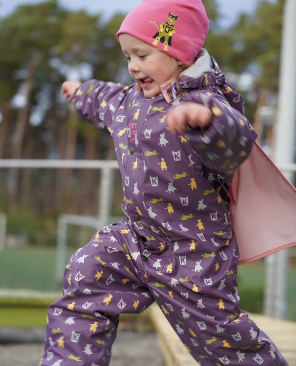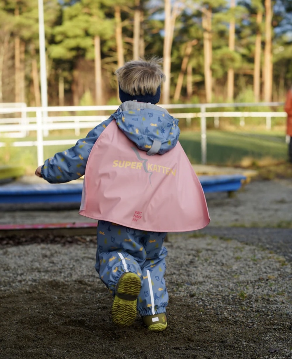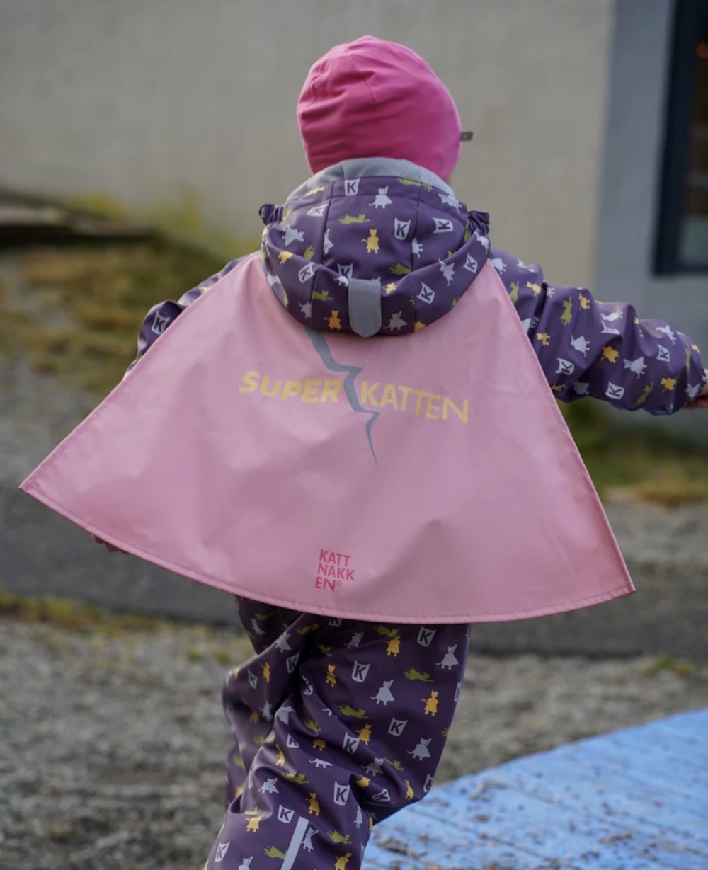 Denne lause superheltkappa frå kolleksjonen Superkatten 2026 kan festast på nesten alt regntøy i kolleksjonen vår (NB! gjeld ikkje Babyregndress Dugg). Me gjer det rett og slett berre på gøy – og fordi det skal vere lov å velje regntøy med eller utan kappe, alt etter humør og superheltambisjonar den dagen.