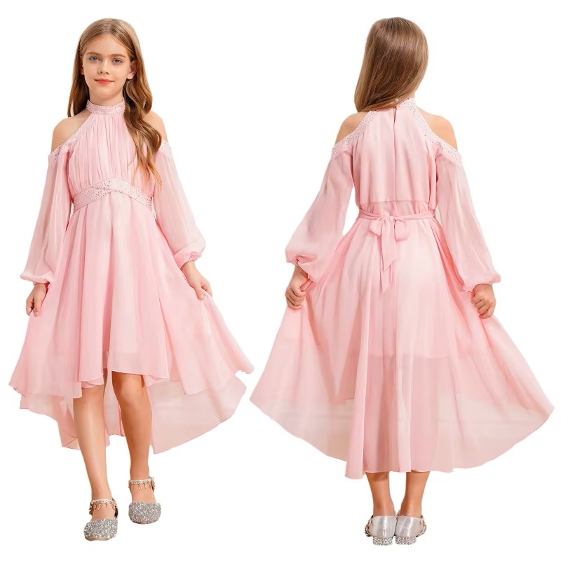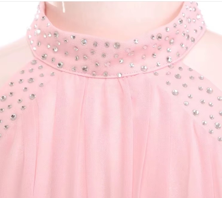 Vakker kjole til jente og ungdom med lange lette armer og åpen skulder. Halterneck hals med små stener og belte i midje med samme små... Les mer