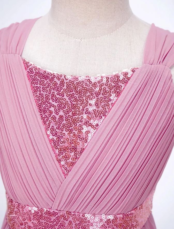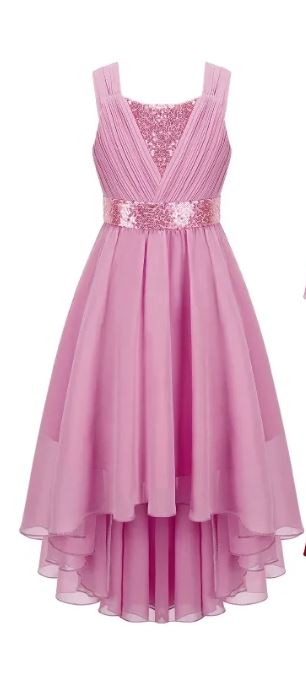 Vakker kjole til jente. Medium lengde. Skrått skjørt. Detaljer med paljetter på overdel og i midje. Sløyfe og lett skjørt med vidde. Passer til anledninger... Les mer