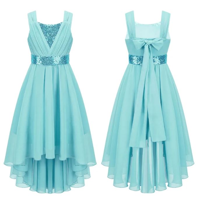 Vakker kjole til jente. Medium lengde. Skrått skjørt. Detaljer med paljetter på overdel og i midje. Sløyfe og lett skjørt med vidde. Passer til anledninger... Les mer